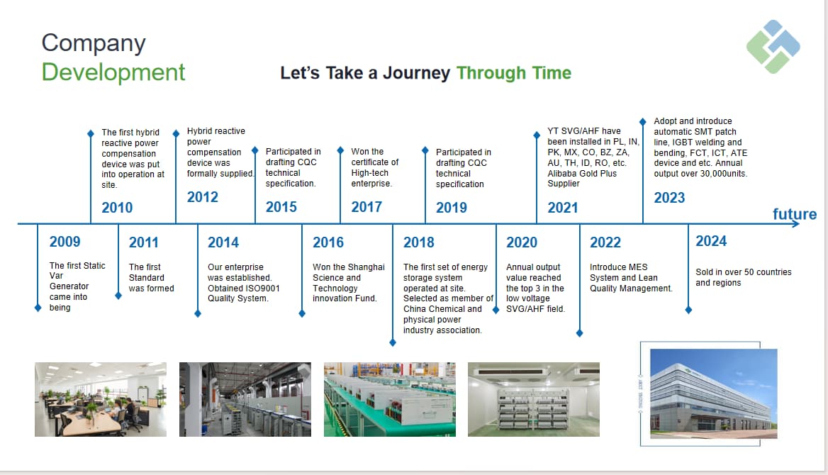 In an era where renewable integration and distributed generation are redefining the global energy structure, YT ELECTRIC remains committed to promoting green power solutions. Our static var generator and active harmonic filter technologies support clean energy transition by ensuring smooth grid operation, improved power reliability, and reduced carbon footprint. By helping industries maintain stable power systems, we contribute to the broader goal of sustainable and efficient energy utilization.